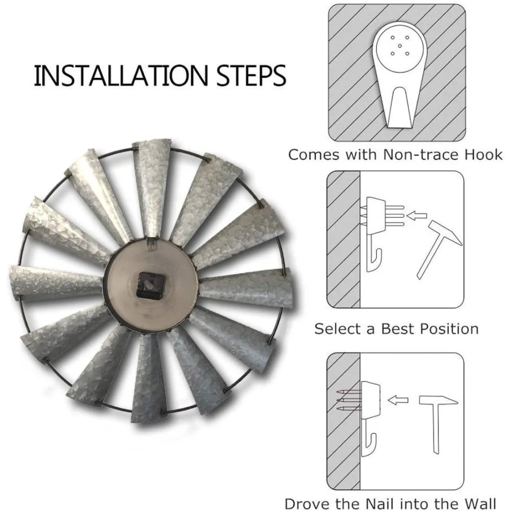 The clock's design includes rust accents on the blades and 12 embossed windmill blades representing each hour. Its unique design and functionality make it a perfect blend of style and practicality for any space.