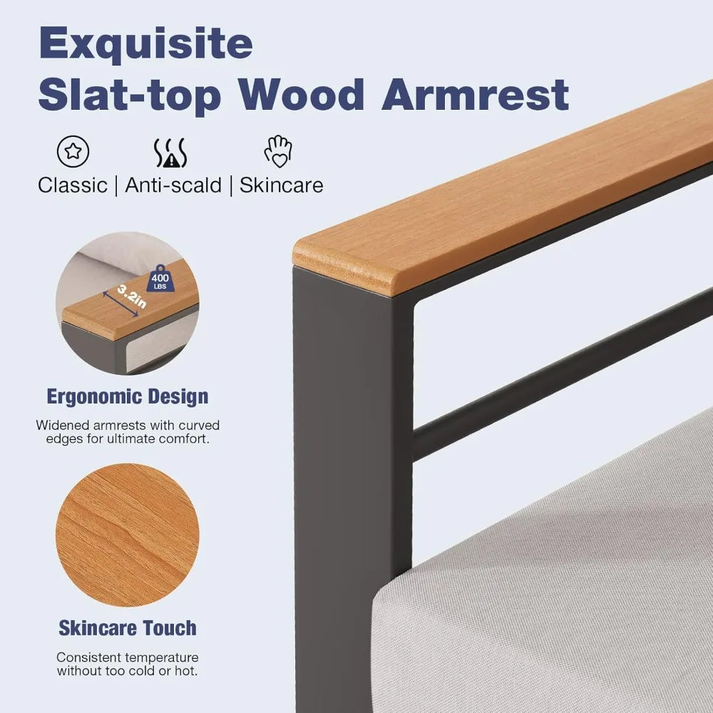 - 【UPGRADED】① Wider 26 in seat Thicker 5 in cushion, industry standard 24 in 5 in; ② Reinforced Structure, Hurricane-grade steel frame with thickened support beams; ③High-end aluminum with heat treatment wood grain coating, more fashionable and reduces the metal heat in summer, protects the skin; ④Top Olefin fabric, easy to clean, ten years without fading