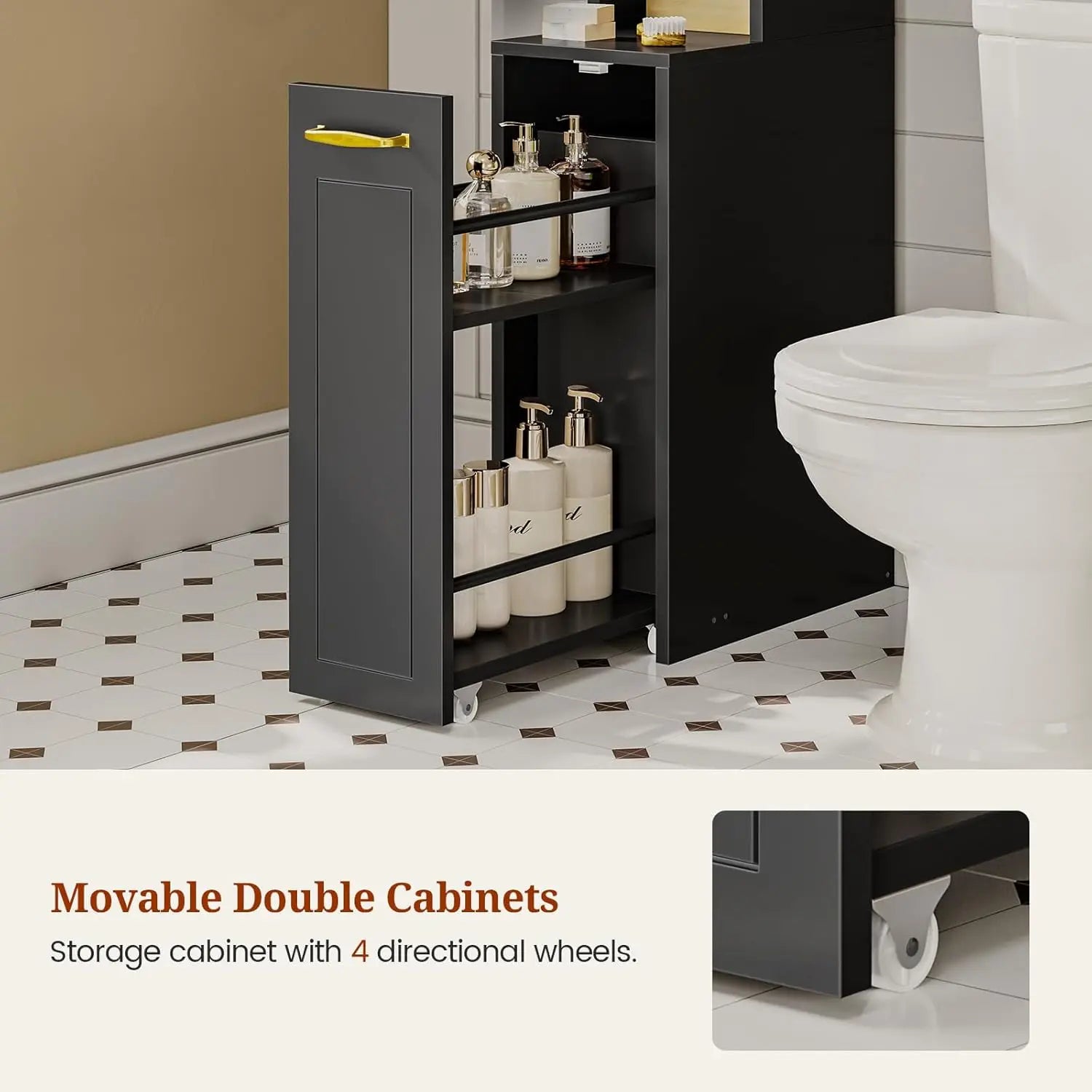 - AMPLE STORAGE SPACE --- This cabinet above toilet comes with 1 cabinet to hide the essentials and also includes 2 open shelves in the middle. 1 paper towel holder box and bottom with casters, small bathroom storage cabinet that can slide in and out smoothly, allowing you to see what's inside at a glance and easily take what you need. The lower panel prevents the drawer from falling out of the bathroom storage cabinet. Convenient access to daily necessities.