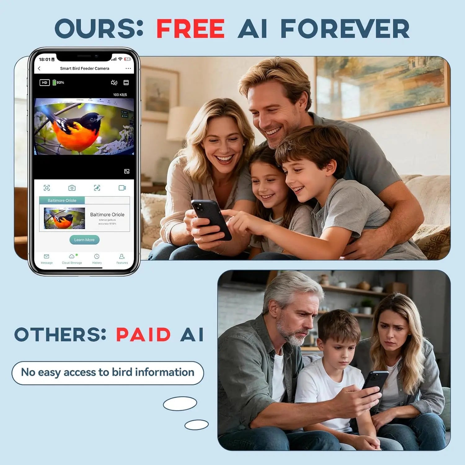 AI Bird Feeder includes Night Vision, Identifies 1100+ Birds, Live 2K HD View with 64GB Card & App Alerts