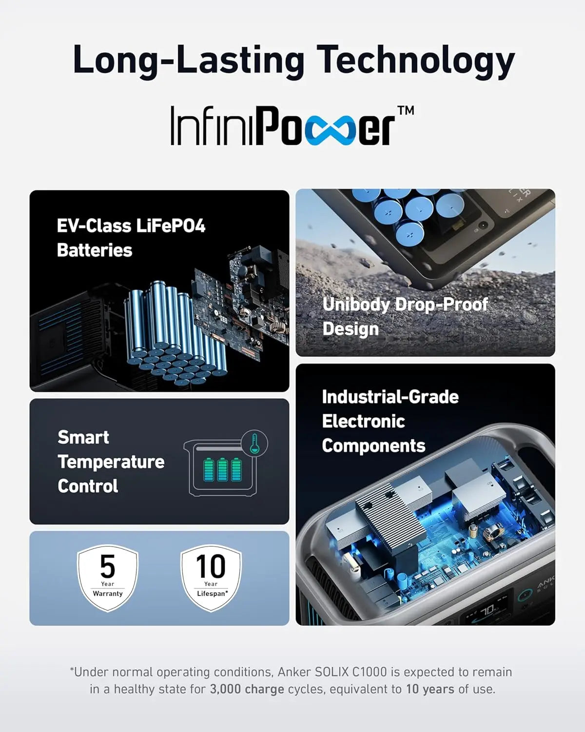 - A Decade of Power: Trust in a decade-long journey with the Portable Power Station, featuring exceptional battery longevity with its LiFePO4 Battery, offering 3,000 battery cycles over a 10-year lifespan, ensuring reliability for years to come.