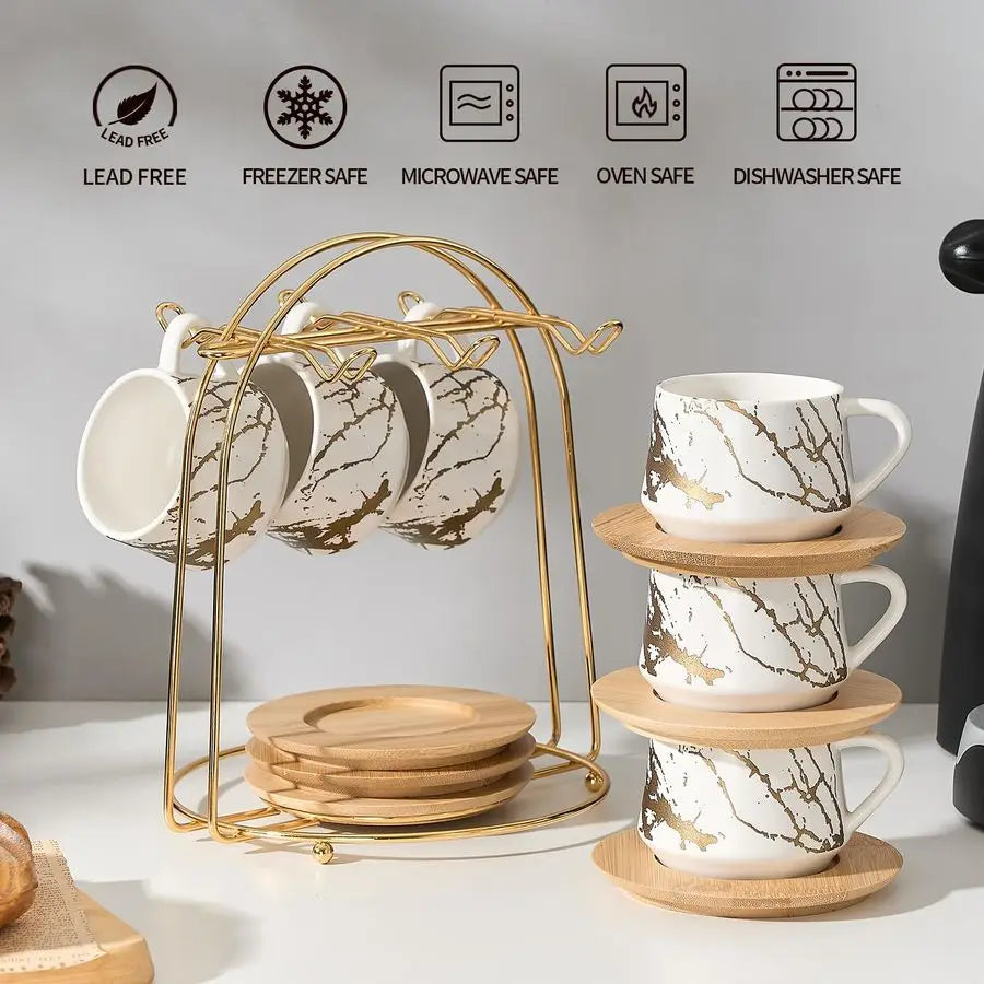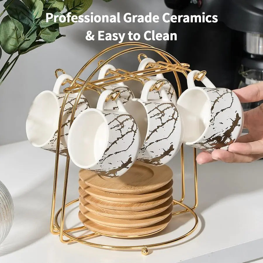Ceramic Espresso Cups with Saucers and Metal Stand, Set of 6