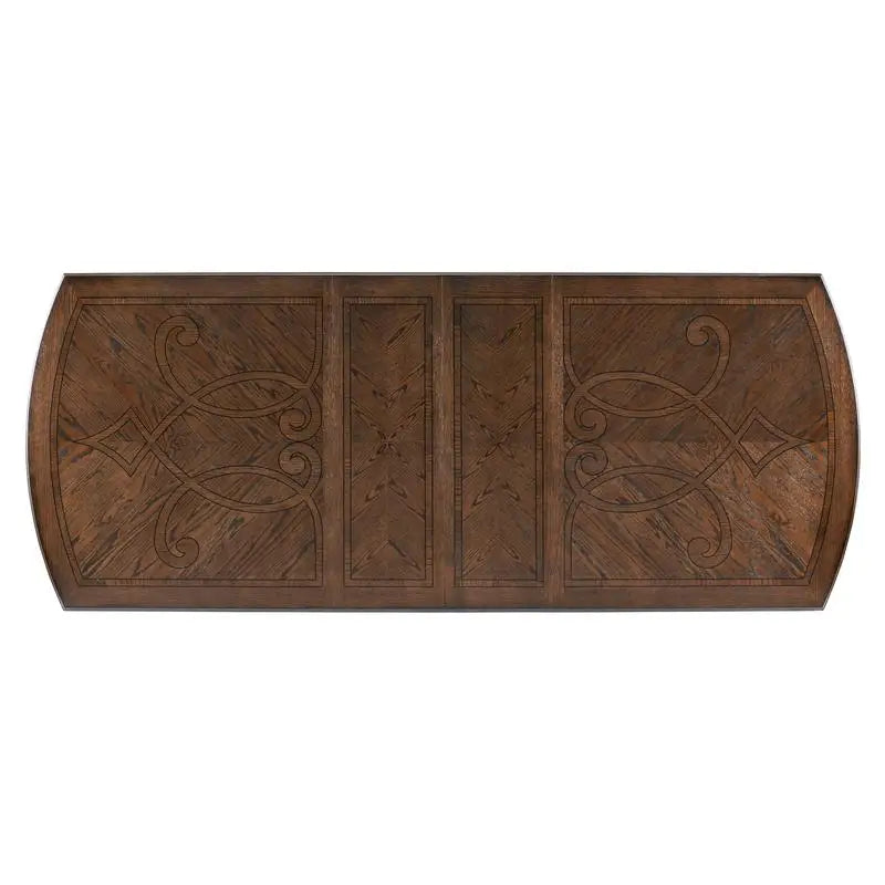 The grand scale of the Bergen Collection invokes a timeless aesthetic for your home's traditional dining room. The dark oak finish highlights the collection's distinct oak veneer and adds contrast to the tabletop's decorative pattern. Traditional accenting abounds throughout the collection with classic routed pilasters, moldings, and decorative pediments