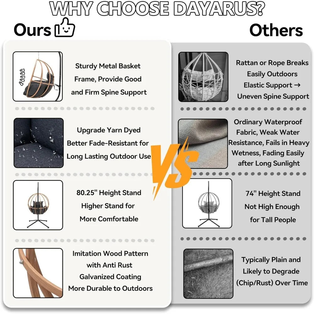 The hanging egg swing chair is equipped with a plush cushion and headrest, made from water- and fade-resistant fabric, ensuring comfort in any weather. Maintenance is a breeze: its rust-resistant metal frame features a wood-grain finish that repels dust and stains, and it only requires a simple wipe with a damp cloth to keep it looking new.