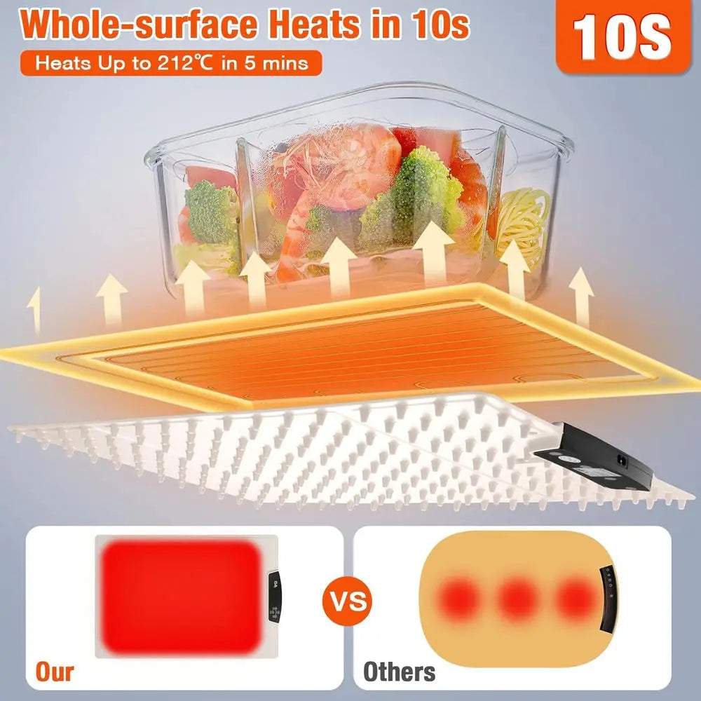 Rapid & Even Heating in 10 seconds: Thanks to advanced heating technology. Use this electric warming tray to keep soups, casseroles, or desserts warm, or as a heating mat for food to maintain evenly heated meals anytime.