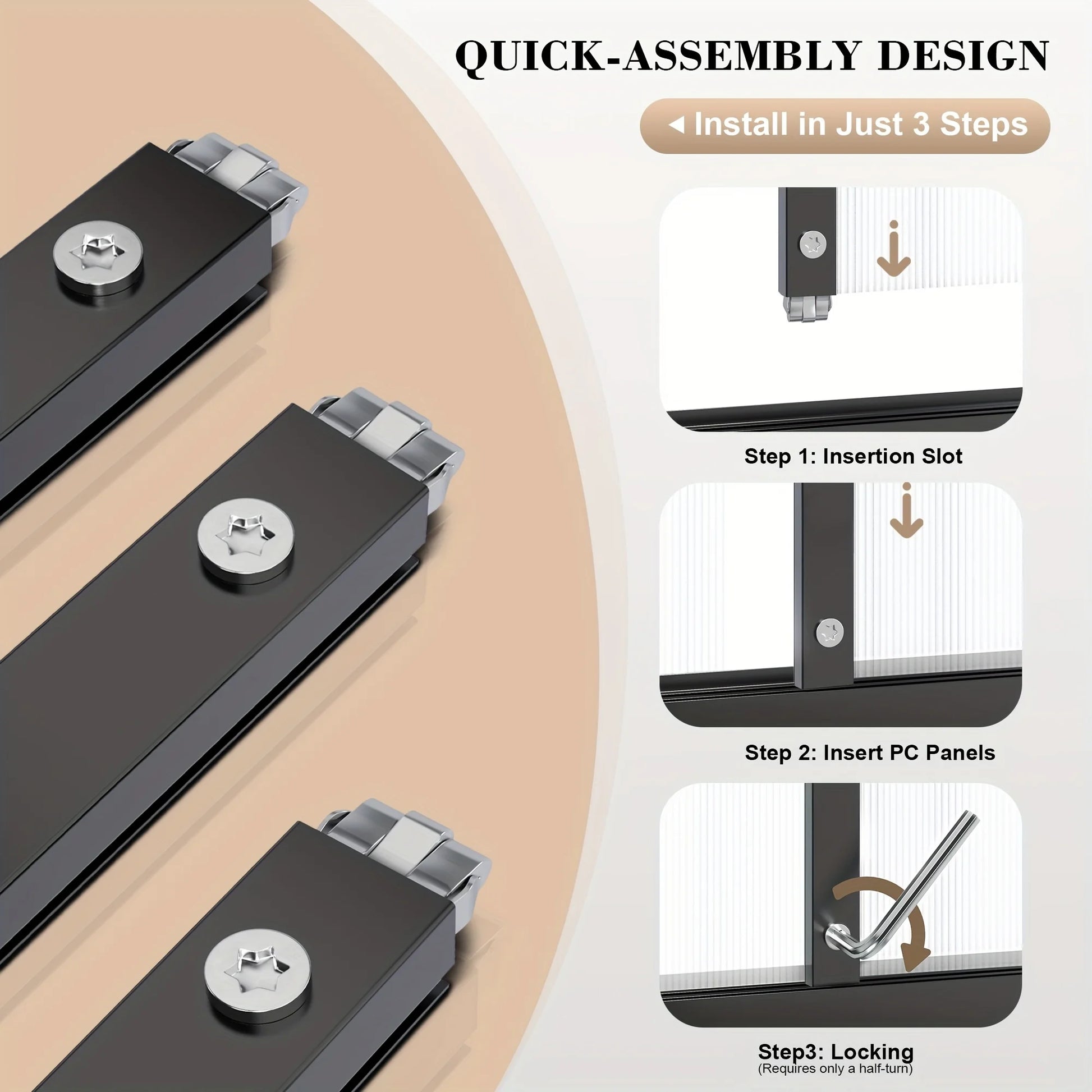 The panels are made of 720g UV-coated polycarbonate, which blocks up to 90% of harmful UV rays while allowing sufficient sunlight to pass through, ensuring optimal temperature balance for healthy plant growth. The robust frame consists of a 6cm aluminum alloy base and 8 diagonal support rods, making the structure resistant to wind, rain, and snow.