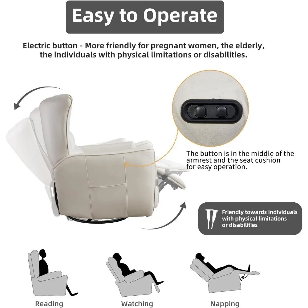- 【Power Recliner and Swivel Glider】-This recliner offers the convenience of power reclining, allowing you to easily adjust the seating position at the touch of a button. The swivel glider feature enables smooth rotation and gentle rocking motions, enhancing relaxation and versatility.