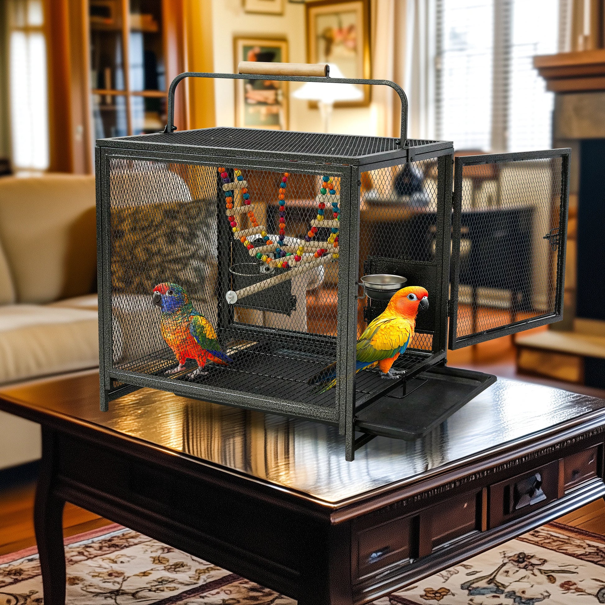 Wrought Iron Bird Play Area/ Carrier Cage with Handle, Wooden Perch & Bird Toys